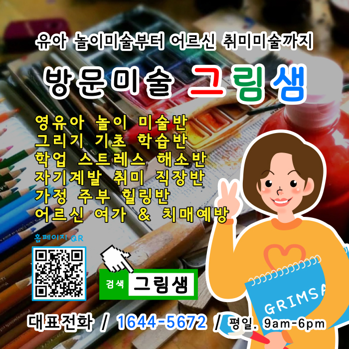 안녕하세요. 예비 그림샘 선생님! 그림샘은 유아놀이 미술 및 아동의 인지발달과 감각발달, 언어발달 융복합 미술 + 미취학 아동 및 초등학생 어린이들을 위한 동물, 사람, 나무 등의 자연물 그리기 기초와 초등교과내용 반영 미술 + 중고생 학업 스트레스 해소 및 직장인 자기계발, 가정주부를 위한 힐링 타임 미술 + 어르신 말벗과 치매예방 그리고 드림스타트처럼 각 지역별 방과후 교육을 지원할 목적으로 가정에 방문하여 미술관련 콘텐츠를 흥미롭고 재미있게 가르치는 전문 미술교육 기업입니다.